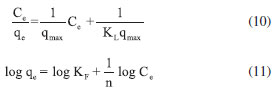Wang et al.,2 promoted the removal of Cr(VI) in aqueous solution using cobalt-coated bamboo charcoal, and the best fit kinetic model was also the pseudo-second order, whose maximum adsorption capacity was 18.52 mg g-1, about half that was obtained by the NPs-Co used in this work, which was 36.1 mg g-1, demonstrating the efficiency of this nanoparticle in Cr(VI) removal. Adsorption isotherms The adsorption isotherms are used to propose a relationship between the adsorbed amount and the equilibrium solution at a fixed temperature.31,32 The experimental data were adjusted to the Langmuir and Freundlich isotherm models, equations 10 and 11, respectively. ![]() wherein kL is the equilibrium constant of the Langmuir model (L mg-1), qmax (mg g-1) is the maximum adsorption capacity, KF is the isothermal constant of Freundlich (L g-1) which is an approximation indicator of the adsorption capacity and nF is the adsorption intensity that measures the deviation of the adsorption linearity. The graphs of the experimental adjustments to the isotherms can be seen in the Figure 4S (in supplementary material), and the values of the parameters obtained by the Langmuir and Freundlich equations are shown in Table 3.