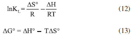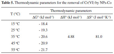 Thermodynamic parameters In order to evaluate the effect of temperature on Cr(VI) adsorption by Co-NPs, the thermodynamic parameters were determined by the Langmuir adsorption isotherm. The thermodynamic parameters, such as the change in Gibbs free energy (ΔG°, kJ mol-1), enthalpy (ΔH°, kJ mol-1), and entropy (ΔS°, J mol-1 K-1) were determined. From the calculated value of KL at different temperatures (15, 25, 35, 45 and 55 °C) and by means of the Van't Hoff equation 12, it was possible to plot a graphic InKL versus T-1. The linear behavior allows the direct estimation of the thermodynamic parameters ∆Sads and ∆Hads, from the respective linear and angular coefficients. The achievement of ΔGads can be calculated from equation 13. ![]() wherein R (8.314 J mol-1 K-1) is the ideal gas constant, T (K) is the temperature in Kelvin, and KL (L mg-1) is Langmuir constant. The thermodynamic parameters obtained for Cr(VI) removal by Co-NPs are shown in Table 5.