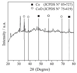 Similar results are reported by Arshadi24 which synthesized cobalt nanoparticles with spherical structures of 5-25 nm and Liang and Zhao8 which synthesized NPs-Co with regular sizes around 10-20 nm. The X-ray diffractogram of Co-NPs is shown in Figure 2. The diffraction peaks at 47.87° and 75.84° correspond to the metallic cobalt phase (JCPDS 5-727). The diffraction peaks at 34.7°, 39.55°, 57.2° and 68.6° correspond to cobalt oxide II (CoO) (JCPDS 42-1300). The peaks related to metallic cobalt were shown to be of low intensity, in relation to the reflections related to the CoO phase. This low intensity can be caused by the rapid oxidation of metallic cobalt under environmental conditions, which is due to its high magnetic susceptibility.23