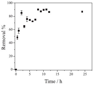 ![]() Figure 4. Reactional equilibrium time between NPs-Co and Cr(VI). Experimental conditions: CCr(VI) = 40.0 mg L-1; volume of solution = 20.0 mL; system temperature = 25 ºC; dose of NPs-Co = 1.0 g L-1; without pH adjustment (8.5); reaction time = 24 hours