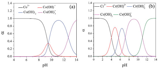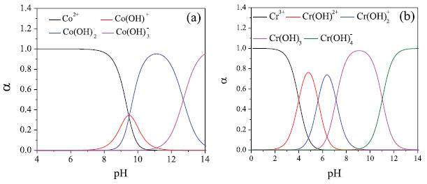 Initially, the adsorption process occurs due to electrostatic interactions between the anion chromate (CrO4-2) and the NPs-Co. Since at pH values below 9.08 the Co-NPs are positively charged, as determined by PZC, which will favor the Cr(VI) adsorption in the form of the chromate anion. With the increase of pH to values above PZC, the surface of the NPs will acquire a negative surface charge, reducing the adsorption of the chromate anion. According to Figure 5B, it can be seen that there is an increase of the final pH independent of the initial pH of the system. In addition, a buffering of the system occurs at pH 9.0. This increase in pH is due to the release of OH- ions into the reaction system due to the redox reactions occurring in aqueous solution (equations 4 and 5). ![]() In addition to electrostatic interaction, oxidation reactions between Co-NPs and Cr(VI) species may also occur, since this process is thermodynamically favorable, as can be observed by the reduction potentials of equations 6 and 7. ![]() In order to verify if Cr(VI) reduces to Cr(III) during the removal process, the method of determining Cr(III) with EDTA was carried out. The Cr(III) was detected and quantified, and the Cr(III) concentration recovery was 110 ± 13%. It can be concluded, therefore, that all Cr(VI) was reduced to Cr(III). Once Cr(VI) was found to be reduced in Cr(III), a species distribution graph was plotted as a function of pH (Figure 6) to verify which species predominated in solution. According to the species distribution graph, at pH 9.0, the Cr(OH)3 fraction is approximately 0.9775. This indicates that Cr(III) is co-precipitated as Cr(OH)3 in NPs-Co.