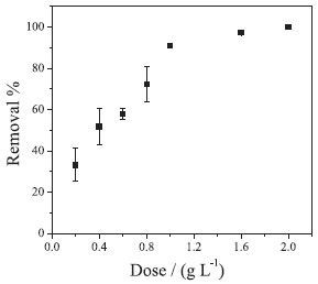 As noted in Figure 7B, the equilibrium removal ability increases with increasing Cr(VI) concentration, reaching approximately 50 mg g-1. This phenomenon can be justified because of a greater interaction between the adsorbate and the nanoparticles. This would facilitate the transfer of Cr(VI) molecules in solution to the active sites of the nanoparticles, due to the increase in the motive force of the reaction medium and, consequently, resulting in an increase of the removal capacity.28,29 The dose effect of NPs-Co on the removal of Cr(VI) was also evaluated. As can be seen in Figure 8, with the increasing of the NPs-Co dose to 1.0 g L-1, the Cr(VI) removal percentage is increased proportionally, reaching about 90% removal. From the 1.0 g L-1 dose, the system tends to equilibrate, reaching about 100% removal with the 2.0 g L-1 dose. The increase in Cr(VI) removal with increasing dose of Co-NPs may be due to the increase in total surface area and the availability of more adsorption sites.30