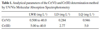 The wide absorption bands in the region of 3500-3100 cm-1 can be attributed to the OH stretching vibration, and the band at 1636 cm-1 can be attributed to HOH binding vibration, indicating the presence of hydroxyl groups and water molecules in the NPS-Co.26 According to Liang and Zhao, 8 cobalt magnetic particles exhibit weak bonds between 525 and 831 cm-1, which may be associated with Co2+-O2stretching vibrations. These same bands were observed in this work. After the reaction it was observed that many peaks disappear and that some have moved and changes in intensity. This fact may be due to the chromium adsorption on the surface of the NPs-Co. Liu et al.,27 in their work observed that after the adsorption of chromium there was displacement of some clusters. The pH of the PZC was obtained from the arithmetic mean of the final pH values that showed a buffer effect (Figure 2S in Supplementary Material). The pH of the obtained PZC was 9.08. Thus at pH values below 9.08, the nanoparticles are positively charged and at pH above 9.08, the nanoparticles are negatively charged. Influence of different parameters on Cr(VI) removal by Co-NPs In order to verify the feasibility of the UV/Vis spectrophotometric method in the determination of Cr(VI) and Cr(III), some analytical parameters were analyzed as linear working range (LWR), limit of detection (LD), and limit of quantification (LQ) as can be seen in Table 1.