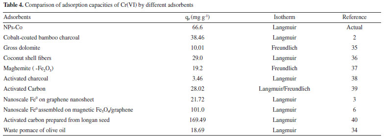 According to the data in Table 3, it is possible to observe that the Langmuir model was better fitted to the experimental data, whose coefficient of determination was 0.980, higher than that of Freundlich (0.950). The Langmuir adsorption model assumes that the adsorbate (Cr(VI)) distribution occurs in a monolayer on a surface, with a finite number of identical sites that are distributed homogeneously on the adsorbent surface.30 In this case, adsorption is limited to one layer only, where all active sites are equal, i.e. the capacity of a molecule to occupy a given site is independent of the occupation of a neighboring site.33 The Langmuir parameters can be used to predict the affinity between adsorbent and adsorbent using the dimensionless separation factor (KL). For values 0<KL<1 the adsorption is favorable.34 According to the results obtained, the adsorption of Cr(VI) by Co-NPs is a favorable process, since the Langmuir constant obtained was 0.0601. Adsorption studies of Cr(VI) by different adsorbents are shown in Table 4. It is possible to verify that the maximum adsorption capacity of Cr(VI) by the NPs-Co obtained in this work (66.67 mg g-1) was superior to most of the adsorbents mentioned below.
