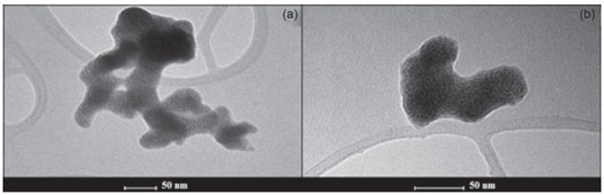 RESULTS AND DISCUSSION Characterization of NPs-Co The synthesized NPs-Co presented a black coloration and magnetic properties since they can be quickly attracted by a magnetic bar to the glass wall, demonstrating its magnetic characteristic (Figure 1S in Supplementary Material). The magnetic properties of the NPs-Co allow them to be easily separated using a magnetic material. Magnetic nanostructured materials follow the Coulomb laws and can, therefore, be manipulated by an external magnetic field.23 The morphological analysis of Co-NPs by Transmission Electron Microscopy (TEM) showed that the nanoparticles have a spherical shape with a size of less than 50 nm (Figure 1). Since this material has high magnetic susceptibility,23 the formation of agglomerates occurs.