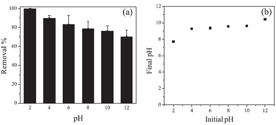 Once the equilibrium time was determined, the initial pH effect of the system on the Cr(VI) removal capacity was evaluated. It can be seen in the Figure 5A that the removal is favored at lower pH values. The removal percentage is about 100% at pH 2.0, whereas, at pH 12.00, the removal percentage is approximately 70%.