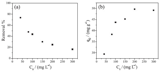 The influence of the initial concentration of Cr(VI) in the removal process by Co-NPs was investigated. As observed in Figure 7A, when the Cr(VI) concentration increases, a significant reduction in the removal rate occurs, which decreases from 80 to 15% when the concentration increases from 40.0 to 300.0 mg L-1. This fact can be justified by the saturation of the active sites present in the NPs-Co at higher concentrations.