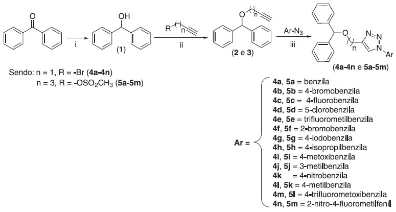 PARTE EXPERIMENTAL Síntese Generalidades Foram utilizados reagentes de grau P.A. para a síntese dos compostos. Benzofenona, boroidreto de sódio (NaBH4), brometo de tetrabutilamônio ((Bu)4NBr), brometo de propargila (3-bromoprop-1-ino), pent-4-in-1-ol, brometo de benzila, brometo de 3-metilbenzila, brometo de 4-metilbenzila, brometo de 2-bromobenzila, álcool 4-fluorobenzílico, álcool 4-clorobenzílico, álcool 4-bromobenzílico, álcool 4-iodobenzílico, álcool 4-nitrobenzílico, álcool 4-metoxibenzílico, álcool 4-trifluorometoxibenzílico, álcool 4-trifluorobenzílico, álcool 4-isopropilbenzílico, sulfato de cobre pentaidratado e ascorbato de sódio, foram adquiridas comercialmente da Sigma Aldrich (St. Louis, MO, Estados Unidos) e utilizados sem prévia purificaçao. Diclorometano, álcool etílico, acetato de etila, hexano, éter etílico, cloreto de sódio, hidróxido de sódio, carbonato de sódio, tolueno e ácido clorídrico foram adquiridos da Vetec (Rio de Janeiro, Brasil). As análises por cromatografia em camada delgada (CCD) foram realizadas utilizando-se placas cromatográficas de sílica-gel impregnadas sobre alumínio. Após eluiçao, as placas de CCD foram observadas sob luz ultravioleta (λ = 254 nm) e reveladas com soluçao de permanganato de potássio (3 g de KMnO4, 20 g de K2CO3, 5 mL de NaOH 5% m/v, 300 mL de água). As separaçoes em coluna cromatográfica foram realizadas usando sílica-gel (70-230 mesh) como fase estacionária. Os solventes utilizados como eluentes foram usados sem prévia purificaçao. Os espectros no infravermelho (IV) foram obtidos empregando-se a técnica da reflectância total atenuada (ATR) em equipamento Varian 660 com acessório GladiATr. Os espectros de ressonância magnética nuclear de hidrogênio (RMN de 1H, 300 MHz) e de carbono (RMN de 13C, 75 MHz) foram obtidos em um espectrômetro VARIAN MERCURY 300. Foram utilizados como solvente o clorofórmio (CDCl3) deuterado. As temperaturas de fusao foram determinadas em aparelho MQAPF-302 e nao foram corrigidas. As leituras das absorbâncias na faixa de comprimento de onda 290-320 nm foram realizadas em um espectrofotômetro (leitor de Elisa) Multiskan Go. Preparaçao do difenilmetanol (1) A um balao de fundo redondo de 100 mL, contendo uma barra de agitaçao magnética, foram adicionados a benzofenona (3,00 g; 16,4 mmol) e 30,0 mL de etanol. A mistura resultante foi mantida sob agitaçao por 30 minutos. Em seguida, foram adicionados a essa mistura 15,0 mL de soluçao de NaBH4 (0,685 g; 18,1 mmol) em etanol gota a gota. Após a adiçao, a mistura foi mantida sob agitaçao por mais 40 minutos a temperatura ambiente. Decorrido este período, a análise da mistura por CCD mostrou que a benzofenona havia sido completamente consumida. A mistura reagente foi, entao, transferida para um béquer, mantido em banho de gelo, contendo 40,0 mL de água e 9,00 mL de HCl concentrado, resultando na formaçao de um precipitado branco. O precipitado foi filtrado a vácuo e lavado com água gelada (3 x 20,0 mL). O sólido branco obtido, difenilmetanol (1), nao foi submetido a nenhum processo subsequente de purificaçao. O composto 1 foi obtido em 92% de rendimento (2,78 g; 15,1 mmol). CCD: Rf = 0,36 (hexano-acetato de etila 8:1 v/v). Tf = 62,8-63,4 °C. IV (ATR) -νmax/cm-1: 3323, 3084, 3059, 3025, 2886, 3025, 1959, 1894, 1805, 1666, 1596, 1453, 1445, 1393, 1346, 1266, 1180, 1171, 1032, 1017, 751, 733, 694, 651, 600, 540. RMN de 1H (300 MHz, CDCl3) δ: 5,84 (s, 1H); 7,26-7,41 (m, 10H). RMN de 13C (75 MHz, CDCl3) δ: 76,2; 126,5; 127,5; 128,5; 143,8. Preparaçao do prop-2-in-1-ilóxi difenilmetano (2) A um balao de fundo redondo de 50 mL, contendo uma barra de agitaçao magnética, foram adicionados o difenilmetanol (1) (1,00 g; 5,43 mmol), o brometo de tetrabutilamônio (0,175 g; 0,542 mmol), 10,0 mL de soluçao aquosa de NaOH 35% m/v e 12,0 mL de tolueno. A mistura resultante foi resfriada em banho de gelo e mantida sob agitaçao magnética por 1 hora. Em seguida, foram adicionados a essa mistura 1,50 mL (16,3 mmol) de brometo de propargila. Após a adiçao, a mistura de reaçao foi mantida sob agitaçao por mais 2 horas à temperatura ambiente. Decorrido esse período, o volume da reaçao foi reduzido em evaporador rotativo. Posteriormente, adicionou-se soluçao saturada de cloreto de sódio à mistura que, entao, foi transferida para um funil de separaçao e a fase aquosa foi extraída com éter etílico (3 x 20,0 mL). Os extratos orgânicos foram reunidos e a fase orgânica resultante foi seca com sulfato de sódio anidro, filtrada e concentrada sob pressao reduzida. O material resultante foi purificado por cromatografia em coluna de sílica-gel utilizando-se como eluente hexano-acetato de etila (8:1 v/v). O composto 2 foi obtido como um óleo incolor em 78% de rendimento (0,941 g; 4,23 mmol). CCD: Rf = 0,70 (hexano-acetato de etila 8:1 v/v). IV (ATR) Preparaçao do pent-4-in-ilóxi difenilmetano (3) O alquino 3 foi sintetizado a partir do pent-4-in-1-ilmetanosulfonato,19 utilizando um procedimento semelhante ao descrito para o composto 2. Porém, a mistura reagente foi mantida sob agitaçao magnética à temperatura de 50 °C por um período de 24 horas. O composto 3 foi obtido como um óleo incolor em 65% de rendimento (0,616 g; 2,46 mmol). CCD Rf = 0,79 (hexano-acetato de etila 8:1 v/v). IV (ATR) Procedimento geral para a obtençao dos derivados 1,2,3-triazólicos da benzofenona 4a-4n A um balao de fundo redondo de 25 mL, contendo uma barra de agitaçao magnética, foram adicionados a azida (1,10 equivalente), o alquino 2 (1,00 equivalente), ascorbato de sódio (0,400 equivalente), 2,00 mL de água destilada e 2,00 mL de diclorometano. Em seguida, foi adicionado o CuSO4·5H2O (0,200 equivalente). A mistura de reaçao permaneceu sob agitaçao por 2 horas à temperatura ambiente. Após o término da reaçao (determinado via análise por CCD) a mistura resultante foi lavada com soluçao satura