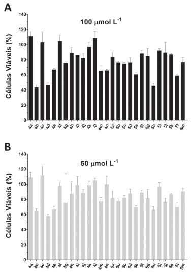 Conforme descrito anteriormente, o valor do FPS in vitro calculado para a substância 4k foi de 6,9 ± 0,53. Considerando-se esta informaçao, pode-se dizer que esta substância atende ao que é preconizado pela ANVISA com respeito aos protetores solares, podendo ser considerado um composto para assegurar a proteçao dos indivíduos com foto tipos menos sensíveis às queimaduras solares. Avaliaçao da atividade citotóxica Os compostos triazólicos derivados da benzofenona sintetizados foram avaliados em relaçao aos seus efeitos citotóxicos contra as linhagens tumorais MDA-MB-231 (adenocarcinoma de mama) e B16F10 (melanoma metastático murino). Conforme mostrado na Figura 1A, na concentraçao 100 µmol L-1, os compostos que apresentaram maior atividade citotóxica contra a linhagem MDA-MB-231 foram 4b, 4d e 5h, os quais reduziram a viabilidade celular em 56,3, 53,7 e 54,4%, respectivamente, podendo ser considerados moderadamente citotóxicos por indicarem IC50 < 100 µmol L-1. Nessa mesma concentraçao, os compostos 4e, 4g, 5e e 5l também indicaram efeito citotóxico significativo, uma vez que reduziram a viabilidade celular em pelo menos 30%, resultado similar ao observado para o flavonoide morina, o qual possui atividade antimetastática sobre células MDA-MB-231.31 Por sua vez, na concentraçao 50 µmol L-1, os compostos 4b, 4d, 4e, 5e, 5h e 5l também foram capazes de reduzir a viabilidade celular em pelo menos 30% (Figura 1B), confirmando assim o potencial citotóxico destas substâncias sobre a linhagem de adenocarcinoma de mama.