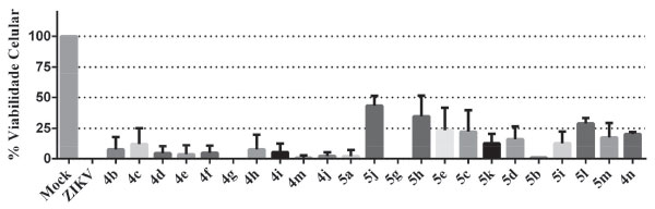 Triagem antiviral Conforme pode ser observado na Figura 2, os compostos 5j e 5h foram os mais eficientes em termos de manutençao da viabilidade celular (aproximadamente 43% e 32%, respectivamente). É importante destacar que alguns compostos nao puderam ser avaliados devido a problemas de precipitaçao durante a conduçao dos ensaios de avaliaçao de atividade antiviral.