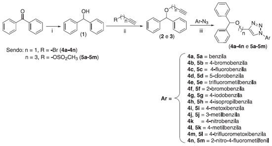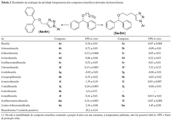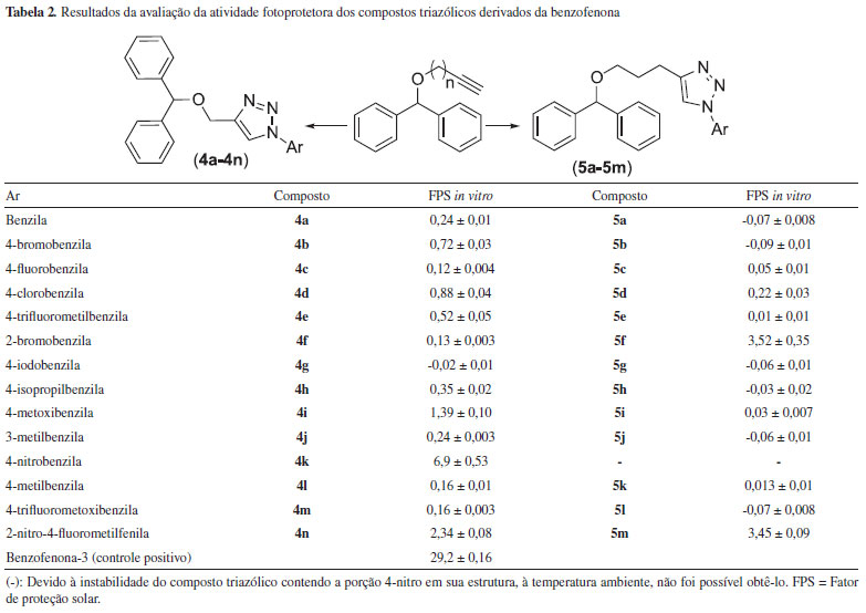 A primeira etapa envolveu a reaçao de reduçao da benzofenona disponível comercialmente com o boroidreto de sódio (NaBH4) em etanol, resultando na obtençao do difenilmetanol (1). Uma vez sintetizado, o difenilmetanol foi tratado com brometo de propargila e soluçao aquosa de NaOH, na presença do catalisador de transferência de fase brometo de tetrabutilamônio (Bu)4NBr), resultando, via substituiçao nucleofílica bimolecular, na formaçao do alquino terminal 2 com 78% de rendimento. De forma análoga ao composto 2, o alquino 3 foi preparado em 65% de rendimento, via reaçao de substituiçao nucleofílica bimolecular entre o difenilmetanol e o pent-4-in-1-ilmetanosulfonato. Este último por sua vez, foi sintetizado a partir do álcool pent-4-in-1-ol.27 Na última etapa da rota sintética, os derivados da benzofenona contendo núcleos triazólicos 4a-4n foram obtidos empregando-se condiçoes reacionais brandas e com rendimentos variando de 42%-88%, via reaçoes "click" catalisadas por cobre(I) entre o alquino 2 e diferentes azidas orgânicas.28 As azidas empregadas na síntese dos derivados triazólicos foram preparadas de forma similar ao descrito na literatura.29 Com o intuito de avaliar a influência do tamanho da cadeia carbônica nas atividades biológicas dos compostos, outra série de derivados da benzofenona contendo o núcleo 1,2,3-triazólico 5a-5m foi obtida de forma semelhante à síntese dos compostos triazólicos discutidos anteriormente (Esquema 1), com rendimentos variando entre 37%-77%. Descriçao dos resultados dos ensaios de avaliaçao da atividade fotoprotetora Os compostos 4a-4n e 5a-5m assim como o controle positivo Benzofenona-3 foram submetidos a testes para a avaliaçao de suas atividades fotoprotetoras aplicando-se a metodologia descrita por Mansur e colaboradores.23 Esse método além de ser considerado simples, preciso e rápido na obtençao de resultados, é muito empregado a fim de facilitar as determinaçoes dos FPS in vitro e eliminar os riscos para a saúde dos seres humanos.23,30 Na Tabela 2, estao descritos os valores de FPS obtidos para os derivados da benzofenona 4a-4n e 5a-5m na faixa do UVB (290-320 nm).