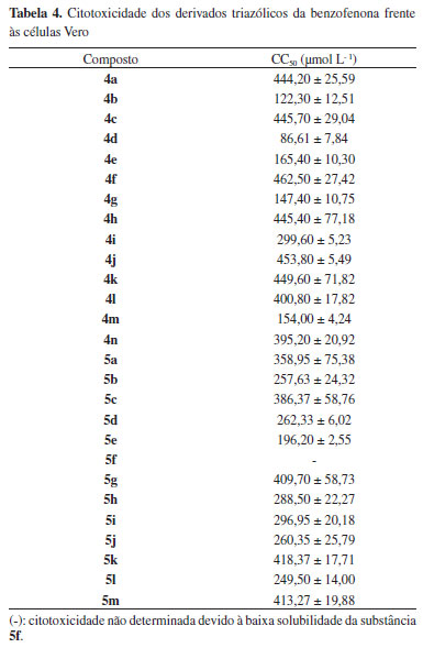 Em relaçao ao efeito citotóxico sobre a linhagem de melanoma metastático B16F10, a qual é sabidamente mais resistente ao tratamento quimioterápico em geral,32 apenas os compostos 5b, 5c, 5j e 5l apresentaram atividade citotóxica na concentraçao 100 µmol L-1, reduzindo a viabilidade celular em aproximadamente 20% (dados nao mostrados). Avaliaçao da atividade antiviral Citotoxicidade dos derivados triazólicos frente às células Vero A avaliaçao do efeito citotóxico frente às células Vero dos compostos sintetizados revelou que apenas 4d apresentou citotoxicidade inferior a 100 µmol L-1. Os demais compostos, conforme apresentado na Tabela 4, apresentaram baixa toxidade frente às células Vero. Os valores de citotoxicidade sao representados por CC50 e correspondem a concentraçao que resulta na morte de 50% das células expostas a concentraçoes crescentes do composto.
