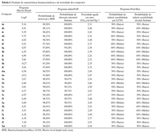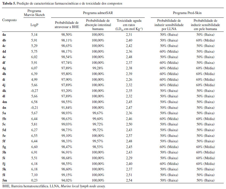 Para ser utilizado em ensaios subsequentes em avaliaçoes de compostos como antivirais, é desejável uma manutençao mínima de 50% da viabilidade celular. Nesse contexto, nenhum dos compostos analisados foi elegível para ser empregado em ensaios subsequentes. Prediçao das características farmacocinéticas e de toxicidade dos compostos 4a-4n e 5a-5m As características farmacocinéticas e de toxicidadein vivoforam preditas utilizando três diferentes programas e estao resumidas na Tabela 5. O coeficiente de partiçao (LogP) predito pelo programa Marvin Sketch indica que a maioria dos compostos possuem baixa polaridade e sao compatíveis com a alta probabilidade de absorçao intestinal e capacidade de atravessar a barreira hematoencefálica. Essas características sao importantes para moléculas que serao utilizadas para tratamento sistêmico de câncer e doenças virais como infecçao por Zika. A capacidade de induzir sensibilidade na pele variou de baixa a média, com nenhum dos derivados apresentando elevado potencial de toxicidade cutânea. Entre os compostos com menor potencial de induzir toxicidade por sensibilidade na pele está o composto 4k, que apresentou maior poder fotoprotetor. Apesar de possuir bom potencial de absorçao, a toxicidade aguda para ratos variou de 2,31 a 2,57 mol L-1e deve ser experimentalmente testada antes dos experimentosin vivo.