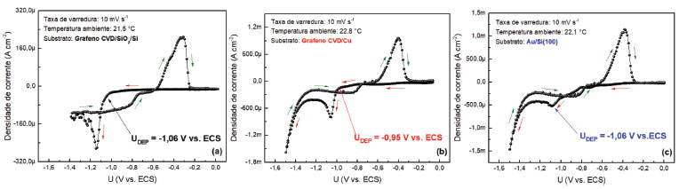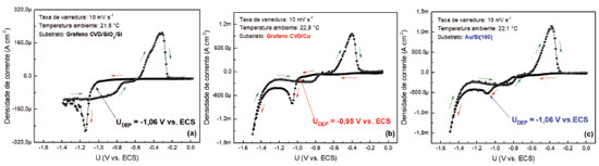 Figura 3. Voltametria cíclica obtida para o (a) grafeno CVD/SiO2/Si, (b) grafeno CVD/Cu, (c) Au/Si(100), em soluçao de sulfato de cobalto com pH ≈ 3,5, em varredura a uma taxa de 10 mV s-1