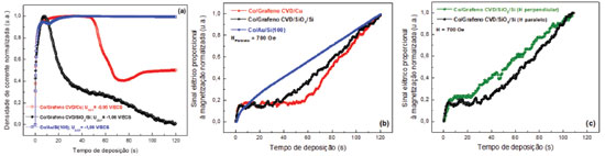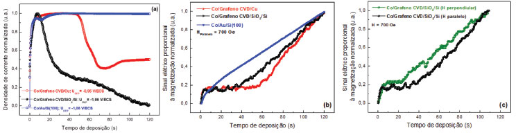 Figura 4. (a) Curvas de densidade de corrente normalizada em funçao do tempo de depósito potenciostático de cobalto sobre grafeno CVD/Cu (vermelho), grafeno CVD/SiO2/Si (preto) e Au/Si(100) (azul); (b) transientes de resposta magnética normalizada do cobalto eletrodepositado potenciostaticamente sobre grafeno CVD/Cu (vermelho), grafeno CVD/SiO2/Si (preto) e Au/Si(100) (azul), com campo de 700 Oe aplicado paralelamente à superfície do substrato; (c) comparaçao entre os transientes de resposta magnética do cobalto eletrodepositado potenciostaticamente sobre grafeno CVD/SiO2/Si, com campo de 700 Oe aplicado em configuraçao perpendicular (verde) e paralelo (preto) ao substrato