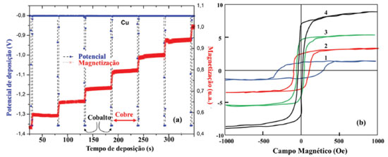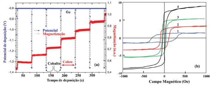 Figura 6. Reproduzida e adaptada da referência 17, com a permissao da AIP Publishing (a) Curvas de potencial elétrico e transiente da resposta magnética da deposiçao intercalada de bicamadas de Co/Cu sobre vidro ITO. Os seis pulsos de deposiçao variaram entre UCo = - 1,35 V vs. MSE e UCu = - 0,8 V vs. MSE; (b) Curvas de histerese obtidas "in-situ" após a deposiçao de [Co(13nm)/Cu(11nm) para 1 bicamada (curva b1); 2,3 e 4 bicamadas (curvas b2, b3 e b4)