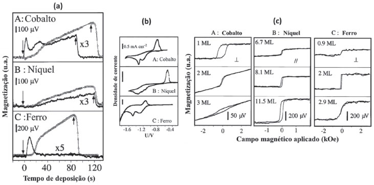 Figura 7. Reproduzida da referência 15 com a permissao da PCCP Owner Societies (a) Transientes "in-situ" M(t) sob campo de 600 Oe, obtidos durante a eletrodeposiçao dos metais sobre Au(111). (A) Cobalto, UDEP = -1,3 V; (B) níquel. UDEP = -1,4 V; (C) Ferro, UDEP = - 1,5 V. Dados foram adquiridos no modo paralelo (// - no plano-símbolos vazios) e no modo perpendicular (⊥ - símbolos cheios). As setas ↑ e ↓ indicam o início de deposiçao e o início do "stripping". A notaçao x3 ou x5 indica a diferença de escalas entre as medidas. (b) Voltametria do substrato Au(111)/mica realizada na célula do EC-AGFM e em configuraçao perpendicular para soluçoes de cobalto(A), níquel(B) e ferro(C). A taxa de verredura foi de 50mV s-1. Ver o texto original para a composiçao das soluçoes.15 (c) Laços de histereses magnéticas adquiridos "in-situ" para cobalto, níquel e ferro sobre Au(111). A configuraçao do sistema para as medidas foram no modo perpendicular para o Fe e o cobalto e no plano para o níquel. As espessuras indicadas sao em monocamadas (ML) e foram extraídas do método de "stripping". Os potenciais de depósitos foram os mesmos da Figura (a) e os potencias de interrupçao dos depósitos para a realizaçao das medidas foram U= -1,15 +/- 0,02 V (cobalto e níquel) ou U = - 1,32 +/- 0,02 V (ferro)