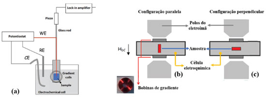 Figura 2. (a) Ilustraçao esquemática do EC-AGFM in-situ. Adaptado de André Gündel11; (b) e (c) Disposiçao da amostra na configuraçao do sistema para medidas magnéticas com campo paralelo ou perpendicular à amostra, respectivamente