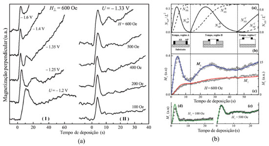 Figura 5. Reproduzida da referência 19, com a permissao da AIP Publishing (a-I) Transientes de M⊥ (t) gravados "in-situ" durante a eletrodeposiçao de Co para um campo fixo de H=600 Oe e variando o potencial de depósito U; (a-II) Transientes variando H para o potencial de depósito constante UDEP = -1,33V; (b) Resultados das simulaçoes teóricas do comportamento da magnetizaçao perpendicular devido à contribuiçao dos átomos da periferia das ilhas de cobalto: para detalhes ver referência 19