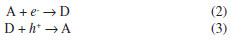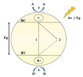 ![]() Figura 6. Mecanismo da fotocatálise heterogênea: 1) excitaçao do e- da BV para a BC; 2) recombinaçao do par e-/h+; 3) transferência do e- da BC para uma molécula aceptora (A) adsorvida na superfície do semicondutor; 4) transferência eletrônica de uma molécula doadora (D) para o h+ da BV