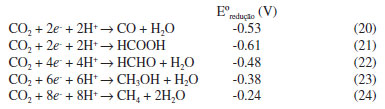 A fotodegradaçao de compostos orgânicos pode ocorrer por via direta e/ou indireta.53 Após a geraçao do par e-/h+, moléculas do poluente adsorvidas na superfície do fotocatalisador podem reagir diretamente com o h+, gerando radicais orgânicos que podem sofrer reaçoes de degradaçao subsequentes. Na oxidaçao indireta, radicais livres sao formados a partir da transferência eletrônica de grupos superficiais adsorvidos, tais como moléculas de água (H2O) e grupos hidroxilas (-OH). Esses radicais, com destaque para os radicais hidroxila (OH), possuem baixa seletividade e alto poder oxidante, podendo assim reagir facilmente com o poluente. Em ambos os casos, reaçoes em cadeia sao iniciadas, podendo resultar na completa oxidaçao do poluente a CO2, H2O e minerais ou na degradaçao parcial com a formaçao de subprodutos.54 Nas reaçoes em fase aquosa, as reaçoes de formaçao dos radicais OH sao consideradas as mais relevantes.54 A capacidade do semicondutor de gerar radicais OH é governada, entre outros fatores, pelo potencial de reduçao de sua BV. Caso este seja mais positivo que o potencial necessário para a ocorrência da reaçao (OHads/OHads = 1,6 V vs EPH), os radicais poderao ser formados.55 O tempo de vida das cargas fotogeradas é um fator essencial para a eficiência fotocatalítica e deve ser suficiente para que as reaçoes redox responsáveis pela geraçao dos radicais ocorram. Nesse sentido, a presença de moléculas "sequestrantes" passíveis de reduçao pelos e- excitados é fundamental para evitar a recombinaçao do par e-/h+. O principal agente receptor de e-em meio aquoso é o oxigênio (O2). No entanto, para que a reaçao ocorra (O2/O2− = -0,33 V vs EPH) é necessário que o potencial da BC do semicondutor seja negativo o suficiente para tal.55 Estratégias como a dopagem metálica,56 utilizaçao de reagentes de sacrifício,57 controle nanocristalino58 e a formaçao de heteroestruturas59 também têm sido utilizadas com o objetivo de prevenir a recombinaçao. A Figura 7 mostra as posiçoes das bandas em relaçao ao vácuo e ao eletrodo padrao de hidrogênio (EPH), bem como o band gap de alguns semicondutores.53