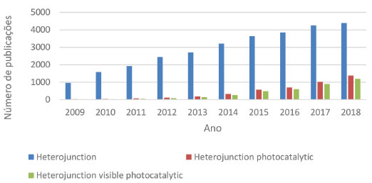 Figura 1. Informaçoes obtidas da 'web of science' monstrando a evoluçao no número das publicaçoes entre os anos de 2009 e 2018. Busca realizada usando os termos: hererojunçao (em inglês, heterojunction), fotocatalítico (photocatalytic) e visível (visible)