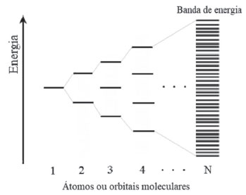 ![]() Figura 2. Formaçao de uma banda eletônica a partir do enfileiramento de N átomos