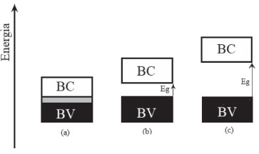 ![]() Figura 3. Diagramas de bandas típicos para a) metais; b) semicondutores e c) isolantes a 0 K