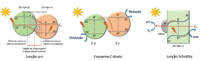 Existem ainda outros tipos de heteroestruturas, tais como, o tipo p-n, esquema-Z e junçao Schottky (Figura 5). Uma heterojunçao p-n é formada pela combinaçao de um semicondutor do tipo p com outro do tipo n. Nesse tipo de heteroestrutura, antes da irradiaçao de luz, os e- do semicondutor do tipo n tendem a difundir-se através da interface p-n para o semicondutor do tipo p, deixando uma espécie carregada positivamente. Enquanto isso, os h+ do semicondutor do tipo p tendem a difundir-se para o semicondutor do tipo n, deixando uma espécie carregada negativamente. A difusao dos e-e h+ continuará até que o equilíbrio do nível de Fermi do sistema seja alcançado. Como resultado, um campo elétrico interno é gerado na regiao próxima à interface p-n. Os e-e h+ fotogerados nos semicondutores do tipo p e n migrarao sob a influência do campo elétrico interno para a BC do semicondutor do tipo n e para a BV do semicondutor do tipo p, respectivamente, o que resulta na separaçao espacial e aumento do tempo de vida das cargas.