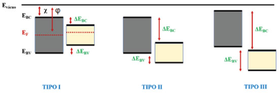 Figura 4. Diferentes tipos de heterojunçoes entre semicondutores. Evácuo é o ponto de referência de energia (i.e. vácuo); EBC é a energia da BC; EBV é a energia da BV; EF denota energia de Fermi; φ é a funçao trabalho e χ retrata a eletroafinidade