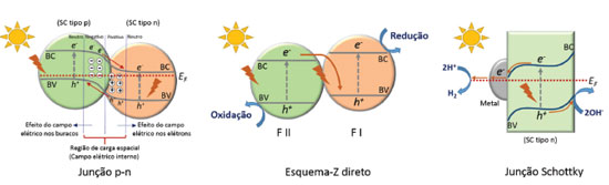Figura 5. Ilustraçao esquemática da separaçao de cargas fotogeradas: em uma heterojunçao p-n; em um esquema-Z direto; e em uma junçao Schottky