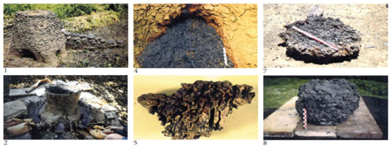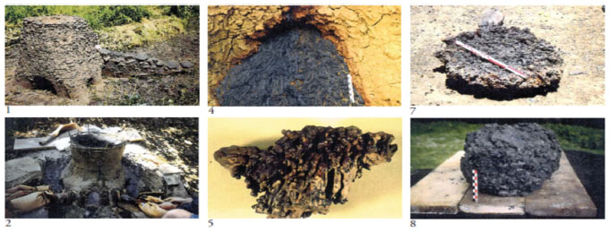 Figura 3. (1) Pequeno forno contemporâneo em Burkina Fasso (2) Reconstituiçao experimental étnico-arqueológica de um forno pequeno; (4) Escória densa expelida de um forno; (5) Escória - sítio arqueológico de Danawel no Senegal - 1995 (7) Esponja de ferro reduzido com impurezas contemporânea. Missao étnico-arqueológica, sítio de Toungaré (Burkina Faso); (8) Reconstituiçao étnico-arqueológica.23