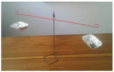 ![]() Figura 4. Experimento com a balança. A balança está mais inclinada à direita devido à oxidaçao da esponja de aço queimada