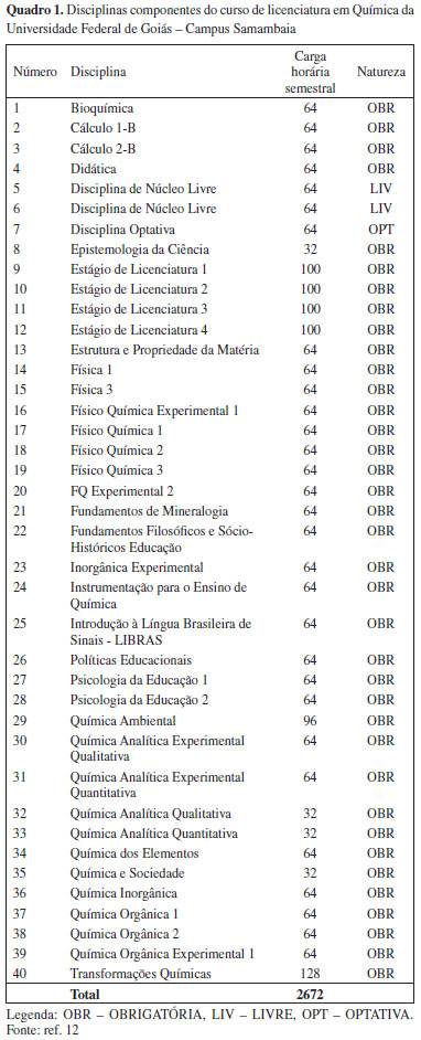 Os critérios da escolha da instituiçao onde realizamos a pesquisa foram: a) ser instituiçao pública; b) disponibilidade para que trabalhássemos juntos nas disciplinas de Ciências e/ou Química; c) ter o currículo aberto às mudanças: d) ser campo de atuaçao no estágio; e) parceira do Movimento Negro. O ciclo espiral de pesquisa-açao que optamos por apresentar nesta comunicaçao foi desenvolvido por professores em formaçao inicial com alunos do 9° ano. A parceria com essa instituiçao surgiu a partir do contato da coordenadora da escola com um dos integrantes do coletivo e o atendimento, por parte da escola, aos requisitos descritos anteriormente. A mesma relatou problemas com situaçoes de racismo na escola e que a professora de Ciências estaria aberta à nossa colaboraçao nas intervençoes pedagógicas do 9° ano, no qual os alunos sao iniciados no conhecimento químico. As intervençoes pedagógicas que ministramos foram sempre no turno vespertino a cada quinze dias. A partir da escolha da escola parceira, o desafio que primeiro nos instigou a pesquisar foi pensar em como ensinar história e cultura africana e afro-brasileira no ensino de Química. É um desafio porque a nossa grade curricular por intermédio das disciplinas específicas do curso de licenciatura (vide Quadros 1 e 2 abaixo) nao abria espaço para que pudéssemos ter acesso a referenciais que nos dessem suporte para essa discussao. Logo, tivemos que construir o nosso estado da arte e conhecer referenciais que nao estao nas estantes de livros da área de Ensino de Química e partir para a açao focados em planejar e intervir.
