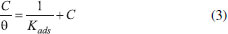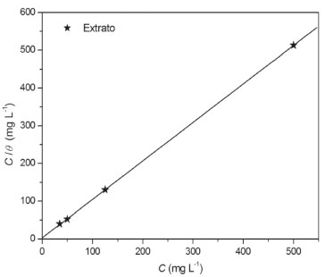 ![]() Figura 4. Isoterma de Langmuir para o extrato de M. arboreus em aço carbono AISI 1020 em solução de H2SO4 1 mol L-1