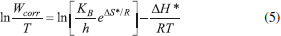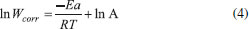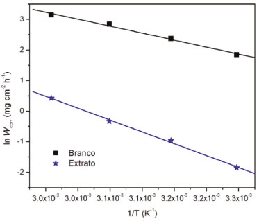 Observa-se o aumento da taxa de corrosão na ausência do inibidor (Branco). Porém, quando o ensaio é realizado na presença de 500 ppm de extrato de M. arboreus, a eficiência de inibição se mantém praticamente constante, com exceção de 338 K, em que é observada uma eficiência de 93,5%. Apesar desse comportamento, é possível afirmar que o filme adsorvido é estável até 328 K, e que sua função inibidora não foi comprometida. A partir dos resultados mostrados na Tabela 2 foi construído o gráfico de Arrhenius, ln Wcorr versus 1/T, que pode ser observado na Figura 5.