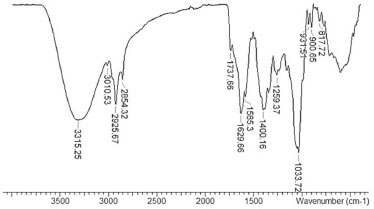 ![]() Figura 1. Espectro de infravermelho obtido do extrato hidroalcoólico das folhas de M. arboreus