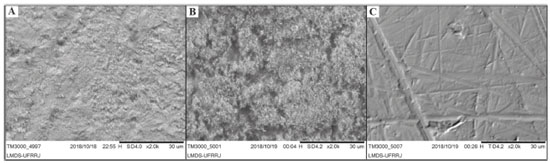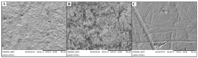 Figura 6. Imagem de microscopia eletrônica de varredura (2000 ×) do aço carbono AISI 1020 imerso em H2SO4 1 mol L-1 na presença de 500 ppm de extrato de M. arboreus. (A), ausência de extrato (B) e superfície antes da imersão (C)