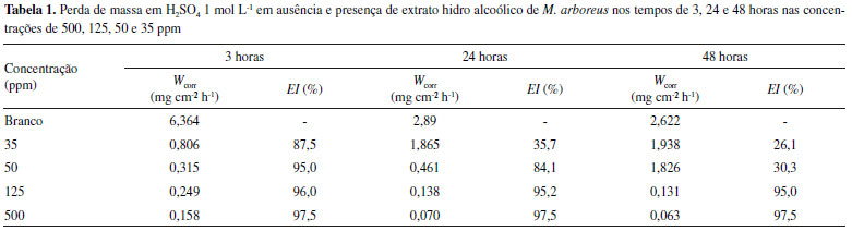 Os sinais de hidrogênios e carbonos referentes a duas metilas presentes nas porfirinas estão representados como singletos em δCH3 3.27/11.29 (H-21/C-21); 3.43/12.13 (H-121/C-121). Os hidrogênios metílicos que acoplam com os grupos metilênico (δCH2 3.71/19.49, H-81/C-81) e metínico (δCH2 3.90/50.91, H-18/C-18) estão representados em δCH3 1.62 (t)/17.45 (H-82 e C-82) e 1.72 (d)/22.63 (H-181 e C-181). Os sinais em δH 4.14 ppm para H-17, δC 50.90 ppm para C-17 e o grupo fitolato representado pelos sinais em δC 29.69 ppm (C-171), δC 31.93 ppm (C-172), δC 173.95 ppm (C-173), δC 17.45, 19.72 e 27.90 ppm (metilas do grupo fitil) e δH 0.88-1.69, 5.32 (d) e 5.38 (t) ppm corroboram com os valores compatíveis presentes no núcleo porfirínico. A prospecção das classes de metabólitos por infravermelho e RMN de 1H e 13C possibilitou identificar a principal classe presente no extrato hidroalcoolico de M. arboreus, como sendo a das porfirinas formadas com anéis tetra-pirrolicos também presentes em extratos de outras espécies vegetais e, que apresentaram efeito quelante frente aos íons de ferro,25,26 indicando assim a possibilidade de apresentar efeito anticorrosivo. Atividade anticorrosiva A eficiência de inibição da corrosão (ηPM) do extrato hidro alcoolico de M. arboreus frente ao aço-carbono AISI 1020 em ácido sufúrco 1 mol L-1 foi avaliada pela técnica gravimétrica de perda de massa, inicialmente realizada na temperatura de 308 K, nas concentrações de 500, 125, 50, 35, 15 ppm, com tempo de imersão de 3, 24 e 48 horas. Posteriormente, a eficiência de inibição da corrosão foi verificada variando a temperatura do meio, em 308, 318, 328, 338 K, com tempo de imersão de 3 horas e concentração de 500 ppm. Tempo de imersão A variação do tempo de imersão é uma ferramenta importante para análise da estabilidade do inibidor e, consequentemente, do filme formado na superfície do metal.27 A Tabela 1 mostra os resultados obtidos nos experimentos de perda de massa nos tempos de 3, 24 e 48 horas, nas concentrações de 500, 125, 50, 35 e 15 ppm.