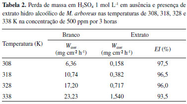 Após a linearização, foram obtidos bons valores de coeficiente de correlação e slope, que são 0,9999 e 1,01, respectivamente. O valor de slope próximo da unidade indica que a adsorção do extrato obedece à isoterma de Langmuir.14 Tal isoterma assume que a adsorção ocorre em sítios específicos e homogêneos na superfície do adsorvente.30 O valor de constante de adsorção Kads foi de 0,330 L mg-1. Na literatura, os valores de Kads obtidos para extratos vegetais são comparáveis com o obtido neste trabalho, sendo para bons inibidores de corrosão em meio ácido, por exemplo, 0,1127 L mg-1 para o extrato das sementes de mamão papaia, e 0,0580 L mg-1 para o extrato da borra de café torrado, entre outros.10,31 O valor de ΔGads é um parâmetro importante para a avaliação da interação entre o agente inibidor e a superfície do metal. No entanto, trata-se de um parâmetro que envolve a massa molecular e, no caso de extratos vegetais, essas moléculas não são totalmente conhecidas, não sendo possível, portanto, realizar sua determinação.10,30-37 Efeito da temperatura A temperatura de trabalho pode influenciar a eficiência da inibição de corrosão e, geralmente, a taxa de corrosão aumenta com um aumento da temperatura. Esse fato se dá devido à evolução acelerada de H2 que, consequentemente, aumenta a taxa de dissolução do metal. Dessa forma, no presente trabalho, foi estudado o comportamento da eficiência de inibição da corrosão do extrato de M. arboreus, na concentração de 500 ppm para as temperaturas de 308, 318, 328 e 338 K, durante 3 horas de imersão. Na Tabela 2 é possível observar os resultados obtidos nos experimentos com a variação de temperatura.
