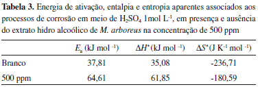 Após a linearização através de regressão linear, de acordo com a equação de Arrhenius (Equação 4), foi calculada a energia de ativação aparente (Ea). ![]() em que Wcorr é a taxa de corrosão, Ea é a energia de ativação aparente, A é o fator de frequência, T é a temperatura absoluta e R é a constante molar dos gases. Na regressão linear foram obtidos bons valores de coeficiente de correlação, que são 0,9958 e 0,9986, para o experimento na ausência e na presença de extrato, respectivamente. De forma complementar a equação de Arrhenius, a entalpia de ativação aparente (ΔH*) e a entropia de ativação aparente (ΔS*) podem ser calculadas a partir da equação de Eyring, que é mostrada na Equação 5: ![]() em que Wcorr é a taxa de corrosão, KB é constante de Boltzmann, h é a constante de Planck, ΔH* é a entalpia de ativação e ΔS* é a entropia de ativação. A Ea, ΔH* e ΔS*obtidas para o processo de corrosão, na solução ácida, na ausência e na presença de extrato podem ser observadas na Tabela 3.