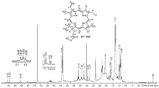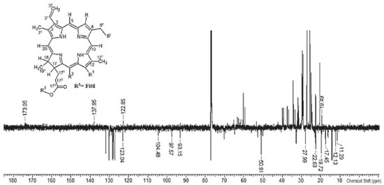A espectroscopia de ressonância magnética nuclear (RMN) pode ser usada como ferramenta de rotina na análise do perfil de metabólitos presentes em extratos obtidos de plantas, pois cada núcleo de hidrogênio e carbono, quimicamente distinto em cada metabolito presente em uma amostra, exibirá um sinal de RMN com uma frequência de ressonância característica. Nesse sentido, essa técnica foi usada para determinar a composição química do extrato hidroalcoólico das folhas de M. arboreus. O espectro RMN de 1H (Figura 2) e de 13C-DEPTQ (Figura 3) apresentaram sinais característicos de esqueleto cíclico tertrapirrólico, presente no sistema heterocíclico das porfirinas.23,24 Os singletos em δH 8.58, 9.42 e 9.56 ppm correspondem aos hidrogênios H-20, H-5 e H-10, os quais estão ligados a carbonos sp2 com sinais em δC 93.15 (C-20), 97.57 (C-5) e 104.48 (C-10) ppm, presentes no sistema aromático porfirínico. Os sinais do grupo vinílico ligado a C-3 (δC 137.96) estão representados em δCH 8.02/123.04 (H-31/C-31) e 6.21, 6.24/122.85 (2H-32/C-32).