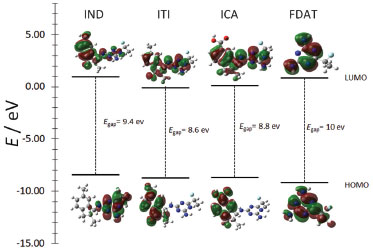 ![]() Figure 3. HOMO and LUMO's distributions on IND, ITI, ICA and FDAT obtained at the wB97XD/6-311++G(2d,2p) level of theory in the aqueous phase employing the PCM solvation model. In all cases the isosurfaces were obtained at 0.08 e/u.a3