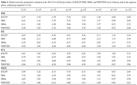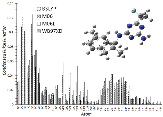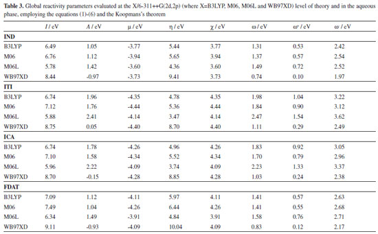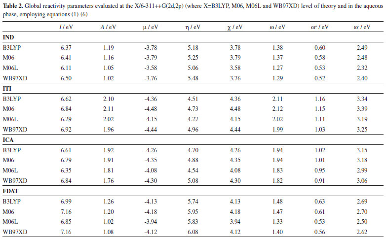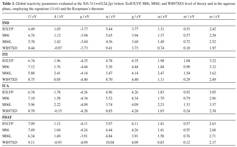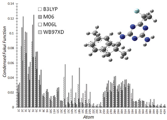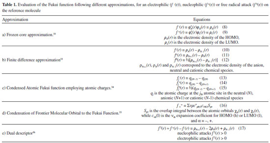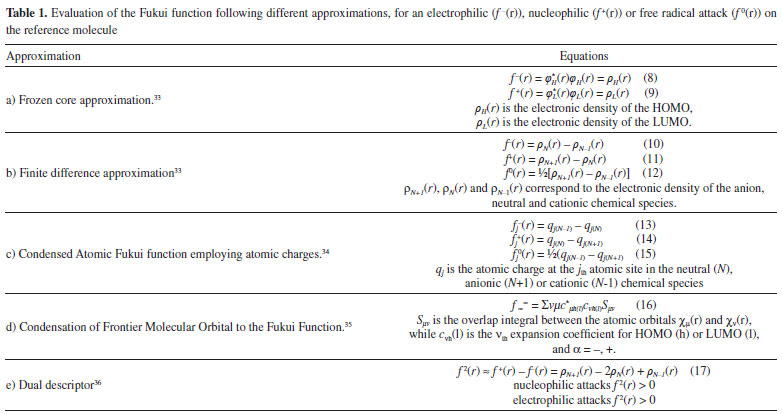 THEORY Global reactivity parameters From the Density functional theory have been defined global reactivity parameters such as the electronic chemical potential (µ), the electronegativity (χ), hardness (η) and the electrophilicity index (ω), which are used to understand the general chemical behavior of a molecule.17,18 They are evaluated within the framework of the DFT through equations (1)-(4), respectively.19-22 ![]() In these equations, the variables E, N and ν (r) are the energy, number of electrons and the external potential exerted by the nuclei, respectively. I is the ionization potential while A corresponds to the electronic affinity. In this sense, some reports suggest that the Koopmans' theorem may become valid for calculations of the global reactivity parameters at the DFT level.23-25 Under this approximation, A is related to the minus the Lowest Unoccupied Molecular Orbital (LUMO) energy (εL), while I is associated with the minus Highest Occupied Molecular Orbital (HOMO) energy (εH).23-25 The electronic chemical potential is associated to the escaping tendency of an electron and is minus the Mulliken electronegativity of molecules,26 the value of η is related to the stability of the molecular system.19,27 while ω measures the susceptibility of chemical species to accept electrons.28 Thus, low values of ω suggest a good nucleophile while higher values indicate the presence of a good electrophile. Also, it is possible to define the electrodonating (ω-) and electroaccepting (ω+) powers as:28 ![]() Local reactivity parameters Also, it is possible to analyze the chemical reactivity on different sites within a molecule employing local reactivity parameters.29,30 Probably, the Fukui Function (f(r)) is one of the local parameters most used to identify the more reactive regions or sites on a molecular system.31,32 The Fukui function (FF) is defined as:33 ![]() where ρ(r) is the electronic density. From equation (7), it is clear that FF indicates the regions where a chemical species will change its electronic density, when the number of electrons is modified, which is useful to identify the preferred either molecular regions, susceptible to electrophilic or nucleophilic attacks.29,33 In this sense, FF can be evaluated by using different approximations such as: a) frozen core approximation, b) finite differences,33 c) atomic charges,34 d) condensation of FMO to FF,35 and e) the dual descriptor,36 see Table 1.
