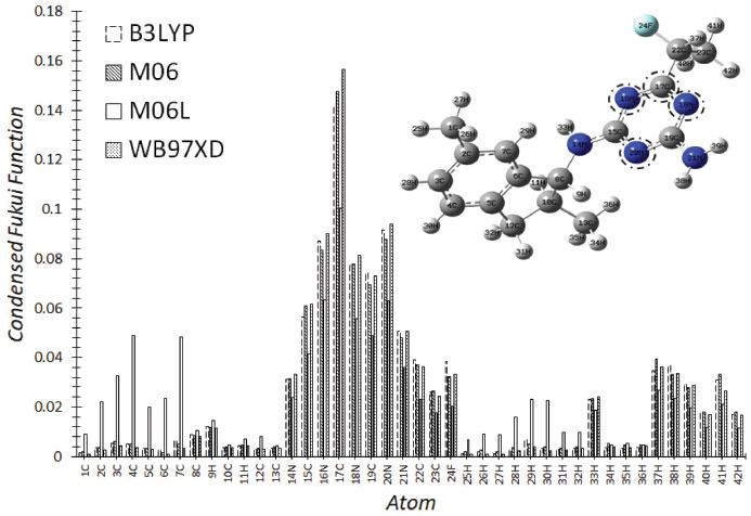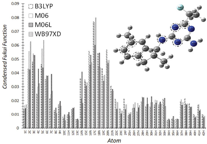 CONCLUSIONS In the present work, we analyzed the chemical reactivity of indaziflam and its metabolites in the aqueous phase. Considering the hardness values, ITI is the more reactive compound, followed by ICA, IND and FDAT. ITI and ICA are the metabolites with lower electrophilic behavior in comparison to IND and FDAT. Employing different levels of theory and approximations the results indicate that for IND, the more reactive sites for electrophilic attacks are located on the carbon atoms of the aromatic ring. For ITI and ICA are located on the nitrogen atom of the central section, and on the nitrogen atoms of amines for FDAT. In the nucleophilic case, carbon atoms on triazine rings, carbonyl group, carboxylic group, and nitrogen atoms of triazine, for IND, ITI, ICA and FDAT, respectively, are the more reactive sites. Finally, the more reactive sites for the case of free radical attacks, are located on the benzene and triazine rings for IND; on the carbonyl group, nitrogen atom of the central section, and nitrogen atoms of triazine for ITI. For ICA on the carboxylic group and nitrogen atom of the central section, while that for FDAT the more reactive sites are located on the nitrogen atoms of triazine ring.