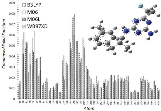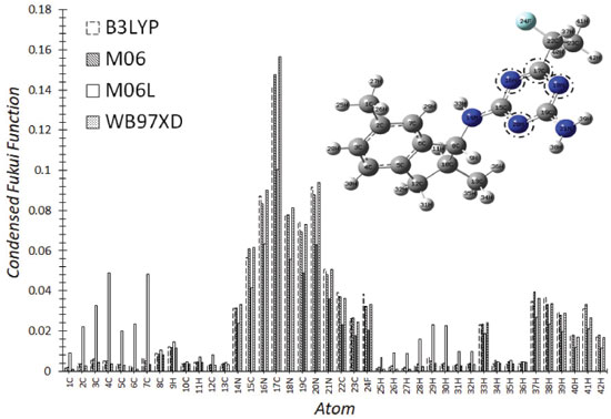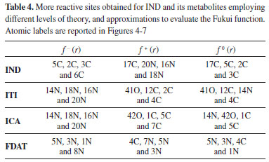 Also, we evaluated the values of CFF through equation (16) and employing the frontier molecular orbitals HOMO and LUMO, however we obtained negative values for CFF, which has not physical meaning. In this sense, it has been reported that equation (16) is quite reliable and stable when is calculated with small basis sets, but is not able to predict the correct values when diffuse functions are employed.56 However, diffuse functions are generally required to investigate nucleophilic susceptibilities.56 Therefore, we employed only the equations, (13)-(15) to evaluate the values of CFF of IND and its metabolites. Similar analysis to those reported in Figures 8-10, are reported, as supplementary material, for ITI, ICA and FDAT metabolites, see Figures 1S-9S in supplementary material. In Table 4, it is presented a summary of the more reactive sites for the molecules analyzed in the present work, considering different levels of theory and approximations to evaluate FF and CFF values.