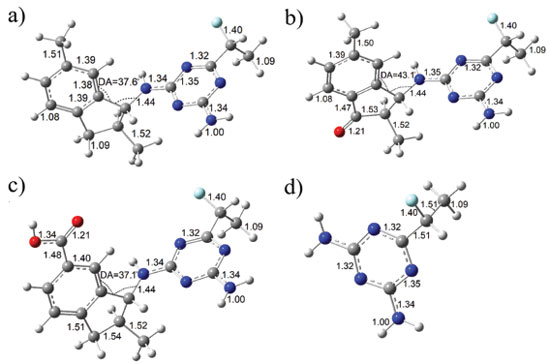 Figure 2. Chemical structures of a) IND, b) ITI, c) ICA and d) FDAT optimized at the wB97XD/6-311++G(2d,2p) level of theory in the aqueous phase employing the PCM solvation model. Bond distances are given in Angstroms, DA=Dihedral Angle