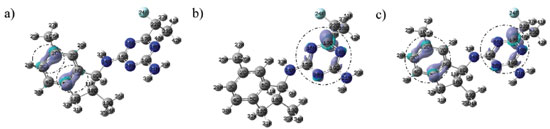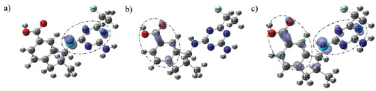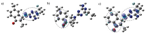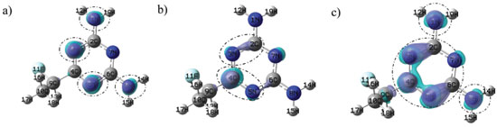 Figure 7. Isosurfaces of the Fukui Functions for FDAT according to equations (10), (11) and (12) at the wB97XD/6-311++G(2d,2p) level of theory employing the PCM solvation model In the case of (a) electrophilic, b) nucleophilic and c) free radical attacks. In all cases the isosurfaces were obtained at 0.008 e/u.a.3, broken circles show the more reactive zones in each molecule