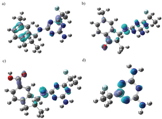 Figure 11. Dual descriptors evaluated at the wB97XD/6-311++G(2d,2p) level of theory employing the PCM solvation model according to equation (17). In all cases, the isosurfaces were obtained at 0.008 e/u.a.3 a). IND, b) ITI, c) ICA and d) FDAT