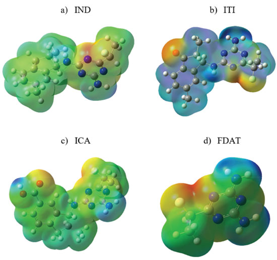 Additional to the global and local reactivity descriptors it is possible to analyze the chemical reactivity through maps of the molecular electrostatic potential (MEP).57 In Figure 12 are depicted the MEP for IND and its metabolites ITI, ICA and FDAT. In these images, areas of negative potential (red color), are characterized by an abundance of electrons while areas of positive potential (blue color), are characterized by a relative lack of electrons. In the case of IND and FDAT the nitrogen atoms exhibit the lowest values of potential in comparison to the other atoms; consequently have a higher electron density around it, ITI and ICA shows that the nitrogen and oxygen atoms as the places with the lowest potential and therefore they are the more electrophilic active sites.